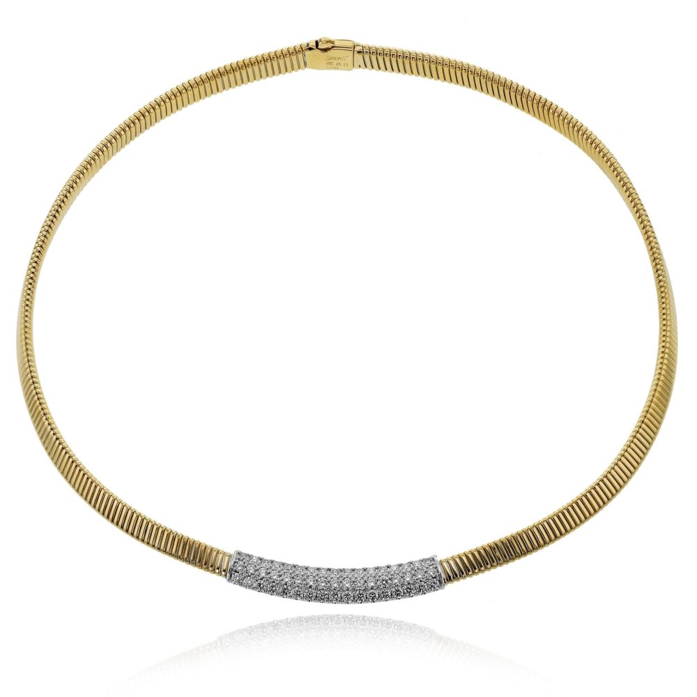This bold choker features a textured gold design and a center bar adorned with over three carats of sparkling white diamonds.