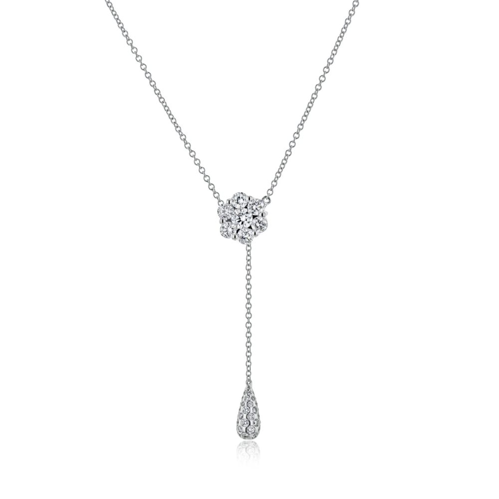 This elegant yet distinctive pendant necklace is adorned with shimmering white diamonds.
