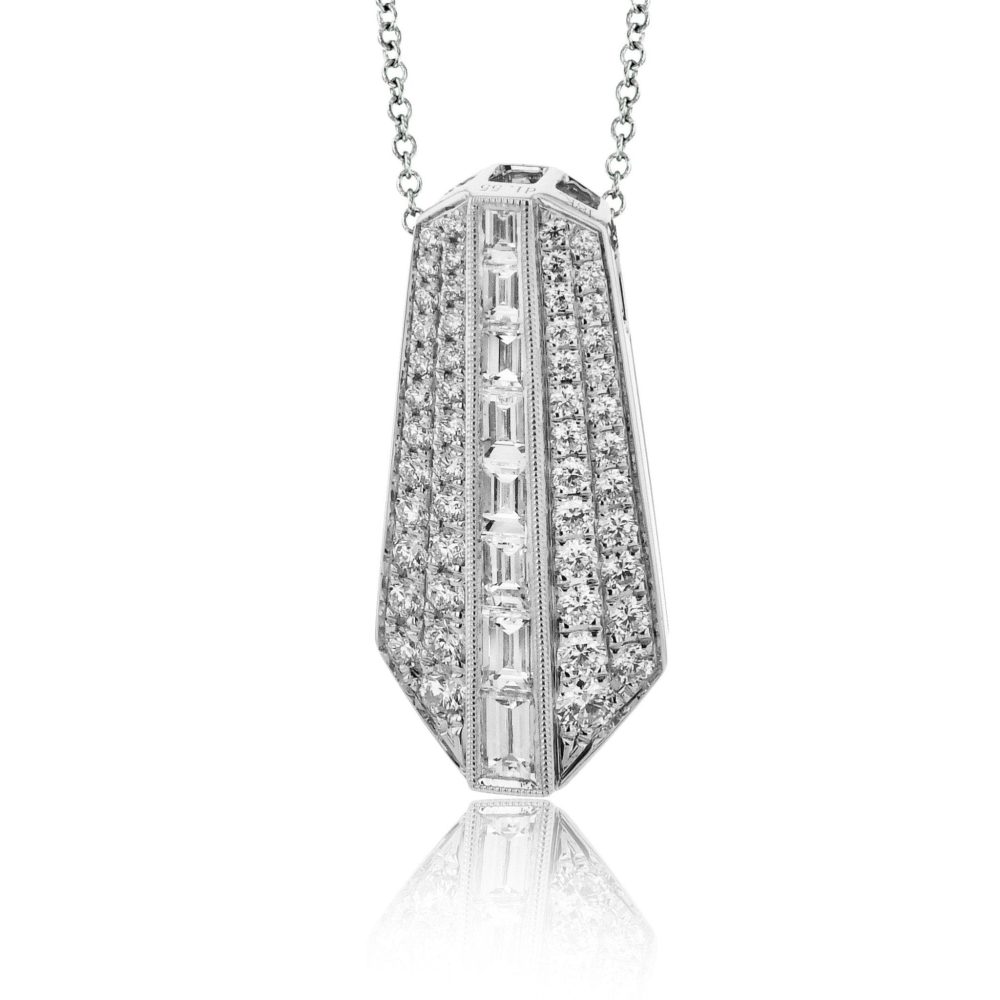 This unique but timeless pendant features a stunning design set with a combination of sparkling round and baguette diamonds.